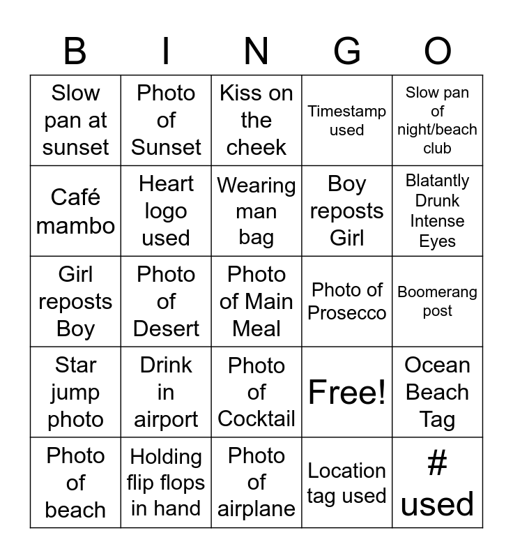 This bingo card has 25 words: Drink in airport, Photo of airplane, Wearing man bag, Photo of beach, Slow pan of night/beach club, Slow pan at sunset, Café mambo, Photo of Sunset, Photo of Prosecco, Photo of Cocktail, Boy reposts Girl, Girl reposts Boy, Free!, Ocean Beach Tag, Heart logo used, # used, Boomerang post, Kiss on the cheek, Blatantly Drunk Intense Eyes, Photo of Desert, Photo of Main Meal, Holding flip flops in hand, Star jump photo, Timestamp used and Location tag used.