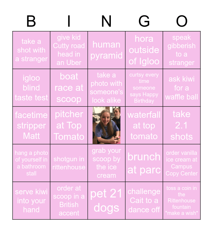 This bingo card has a free space and 24 words: shotgun in rittenhouse, order at scoop in a British accent, take a photo with someone's look alike, serve kiwi into your hand, speak gibberish to a stranger, take a shot with a stranger, igloo blind taste test, give kid Cutty road head in an Uber, waterfall at top tomato, grab your scoop by the ice cream, curtsy every time someone says Happy Birthday, facetime stripper Matt, brunch at parc, order vanilla ice cream at Campus Copy Center, boat race at scoop, challenge Cait to a dance off, take 2.1 shots, human pyramid, ask kiwi for a waffle ball, pitcher at Top Tomato, toss a coin in the Rittenhouse fountain *make a wish*, hang a photo of yourself in a bathroom stall, hora outside of Igloo and pet 21 dogs.