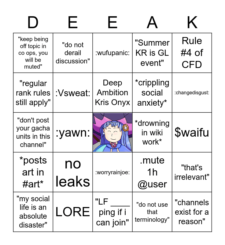 This bingo card has a free space and 24 words: no leaks, LORE, Deep Ambition Kris Onyx, "my social life is an absolute disaster", Rule #4 of CFD, "keep being off topic in co ops, you will be muted", "regular rank rules still apply", "do not derail discussion", *drowning in wiki work*, :worryrainjoe:, *crippling social anxiety*, "don't post your gacha units in this channel", .mute 1h @user, "that's irrelevant", :Vsweat:, "do not use that terminology", $waifu, :wufupanic:, :changedisgust:, :yawn:, "channels exist for a reason", *posts art in #art*, "Summer KR is GL event" and "LF ____ ping if i can join".