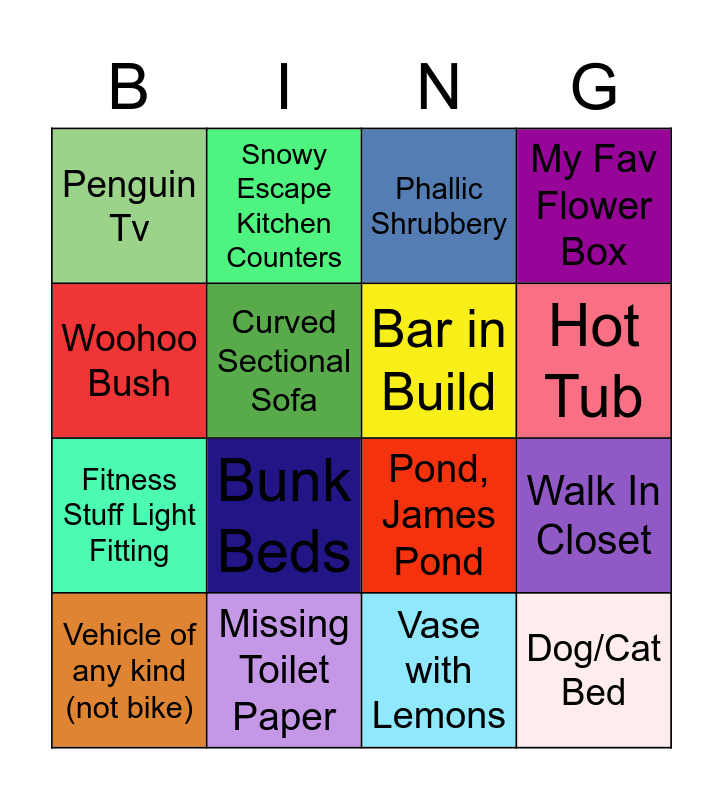 This bingo card has 16 words: Missing Toilet Paper, Walk In Closet, Phallic Shrubbery, Penguin Tv, Fitness Stuff Light Fitting, Snowy Escape Kitchen Counters, Pond, James Pond, Vase with Lemons, Woohoo Bush, Curved Sectional Sofa, Vehicle of any kind (not bike), My Fav Flower Box, Bunk Beds, Hot Tub, Bar in Build and Dog/Cat Bed.