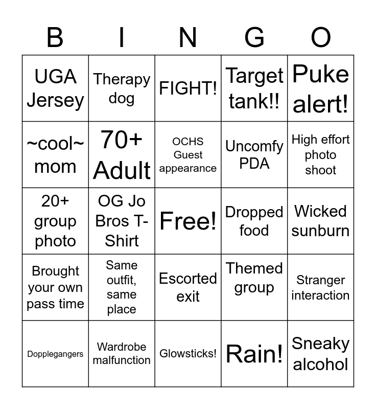 This bingo card has a free space and 24 words: Same outfit, same place, Wardrobe malfunction, OCHS Guest appearance, Dopplegangers, Puke alert!, UGA Jersey, ~cool~ mom, Therapy dog, Dropped food, Escorted exit, Uncomfy PDA, 20+ group photo, Themed group, Stranger interaction, 70+ Adult, Rain!, Wicked sunburn, FIGHT!, High effort photo shoot, OG Jo Bros T-Shirt, Sneaky alcohol, Brought your own pass time, Target tank!! and Glowsticks!.