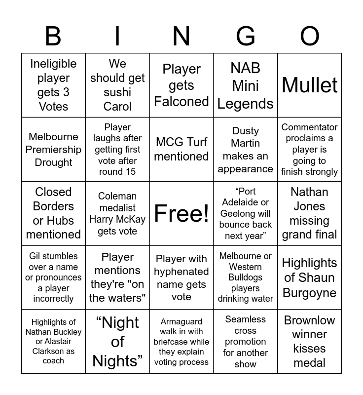 This bingo card has a free space and 30 words: “Night of Nights”, Gil pauses for dramatic effect, Coleman medalist Harry McKay gets vote, North Melbourne player gets 3 Votes, Ineligible player gets 3 Votes, Player gets Falconed, Player laughs after getting first vote after round 15, Player with hyphenated name gets vote, “Port Adelaide or Geelong will bounce back next year”, Armaguard walk in with briefcase while they explain voting process, Nathan Jones missing grand final, Brownlow winner kisses medal, Seamless cross promotion for another show, Rising Star Luke Jackson gets a vote, Commentator proclaims a player is going to finish strongly, Commentator asks whether the early leader can hold on, Melbourne or Western Bulldogs players drinking water, Gil stumbles over a name or pronounces a player incorrectly, Player mentions they're "on the waters", Mullet, Closed Borders or Hubs mentioned, Reference to Olympics, We should get sushi Carol, Dusty Martin makes an appearance, Melbourne Premiership Drought, NAB Mini Legends, Highlights of Shaun Burgoyne, Highlights of Nathan Buckley or Alastair Clarkson as coach, MCG Turf mentioned and Player located outside of Perth interviewed.