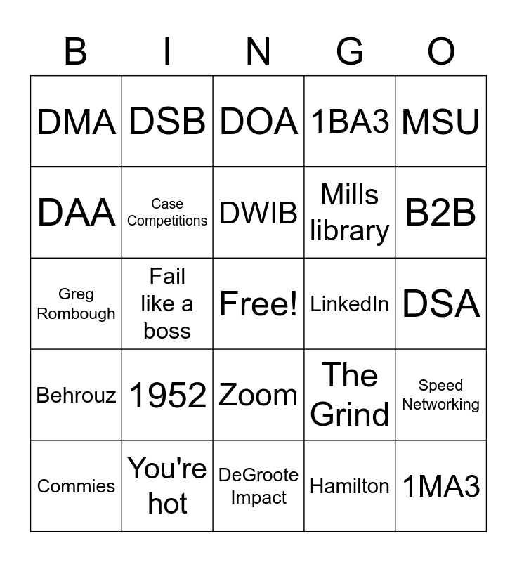 This bingo card has a free space and 24 words: 1952, You're hot, DWIB, Commies, MSU, DMA, DAA, DSB, LinkedIn, Zoom, Mills library, Greg Rombough, The Grind, Speed Networking, Case Competitions, Hamilton, DSA, DOA, B2B, Fail like a boss, 1MA3, Behrouz, 1BA3 and DeGroote Impact.