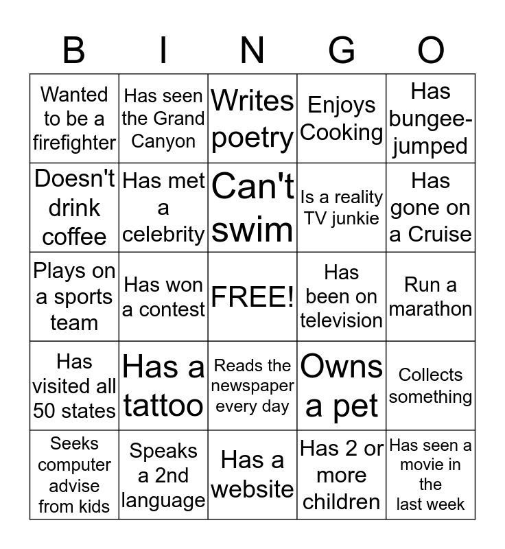 This bingo card has a free space and 24 words: Has a tattoo, Speaks a 2nd language, Can't swim, Seeks computer advise from kids, Has bungee-jumped, Wanted to be a firefighter, Doesn't drink coffee, Has seen the Grand Canyon, Has been on television, Reads the newspaper every day, Is a reality TV junkie, Plays on a sports team, Owns a pet, Collects something, Has met a celebrity, Has 2 or more children, Run a marathon, Writes poetry, Has gone on a Cruise, Has won a contest, Has seen a movie in the last week, Has visited all 50 states, Enjoys Cooking and Has a website.