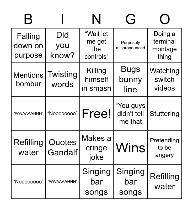 ⚠ This card has duplicate items: Mentions bombur (2), Quotes Gandalf (2), Makes a cringe joke (2), Purposely mispronounced (2), Stuttering (2), Over exaggerating (2), Did you know? (2), Denying someone as a joke (2), Bugs bunny line (2), Pretending to be angery (2), Falling down on purpose (2), Twisting words (2), Singing bar songs (2), Weird laugh (2), Watching switch videos (2), “Noooooooo” (2), Killing himself in smash (2), Disgusted face (2), Doing a terminal montage thing (2), Refilling water (2), “WWAAAAHHH” (2), “Wait let me get the controls” (2), “You guys didn’t tell me that (2), Wins (2), “THATS NOT FAIR” (D:) (2)