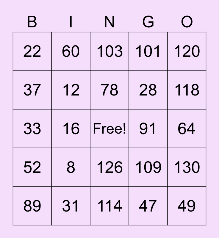 This bingo card has a free space and 24 words: 8, 31, 78, 89, 120, 22, 37, 60, 91, 126, 28, 33, 109, 130, 12, 47, 64, 103, 118, 16, 49, 52, 101 and 114.