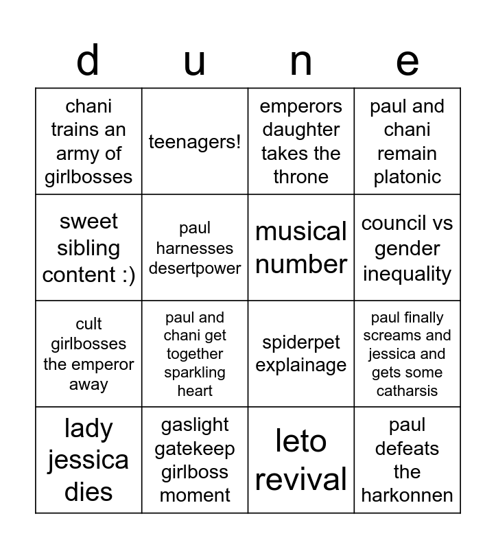 This bingo card has 16 words: gaslight gatekeep girlboss moment, paul finally screams and jessica and gets some catharsis, emperors daughter takes the throne, chani trains an army of girlbosses, cult girlbosses the emperor away, teenagers!, spiderpet explainage, leto revival, sweet sibling content :), paul harnesses desertpower, lady jessica dies, paul and chani remain platonic, paul and chani get together sparkling heart, council vs gender inequality, musical number and paul defeats the harkonnen.