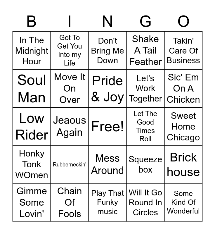 This bingo card has a free space and 54 words: Miss You, Honky Tonk WOmen, Tumbling Dice, 60 minute Man, Mess Around, Flip Flop & Fly, Shake A Tail Feather, Mustang Sally, Soul Man, Stuck In The Middle With You, In The Midnight Hour, Papa's Got A Brand New Bag, Chain Of Fools, Gimme Some Lovin', Tell Mama, Play That Funky music, Some Kind Of Wonderful, Let's Work Together, Suzie Q, Sweet Home Chicago, Squeeze box, You Never Can Tell, Let The Good Times Roll, Takin' Care Of Business, Rockin' Pneumonis & The boggie Woogie Flu, Got To Get You Into my Life, Boys Are back In Town, Rockin' At Midnight, Just A Gigolo, Will It Go Round In Circles, Vehicle, Moondance, Bad Bad Leroy Brown, Joy To The World, Don't Bring Me Down, Ice Cream man, Low Rider, Brick house, Wrap it Up, Move It On Over, Jump Jive and Wail, Keep Your Hands To Yourself, The House Is Rockin, Born To boogie, Rubberneckin', Katmandu, Hard To handle, Tuff Enuff, Pride & Joy, Jeaous Again, Sic' Em On A Chicken, My Name Is Bocephus, Drinkin' My baby Goodbye and Still In Saigon.