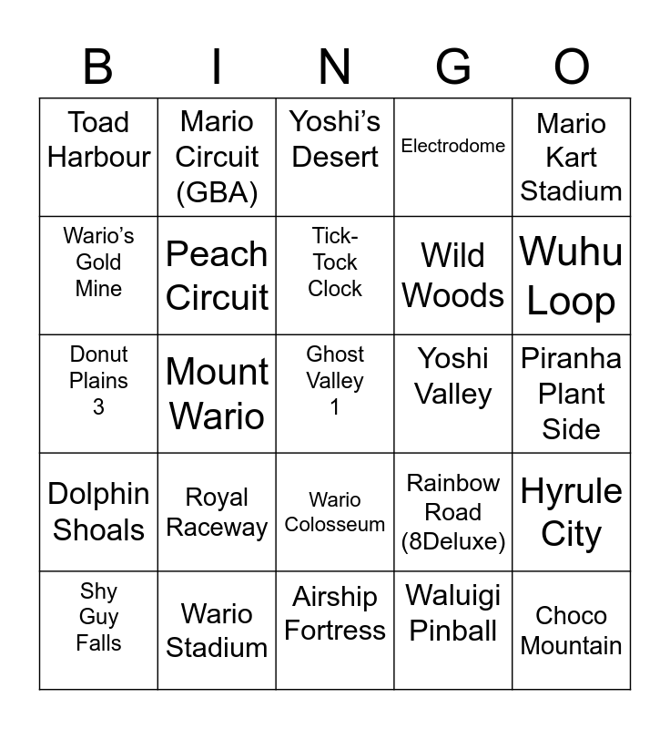 This bingo card has a free space and 24 words: Royal Raceway, Wario Stadium, Tick-Tock Clock, Shy Guy Falls, Mario Kart Stadium, Toad Harbour, Wario’s Gold Mine, Mario Circuit (GBA), Yoshi Valley, Wario Colosseum, Wild Woods, Donut Plains 3, Rainbow Road (8Deluxe), Hyrule City, Peach Circuit, Waluigi Pinball, Piranha Plant Side, Yoshi’s Desert, Wuhu Loop, Mount Wario, Choco Mountain, Dolphin Shoals, Electrodome and Airship Fortress.