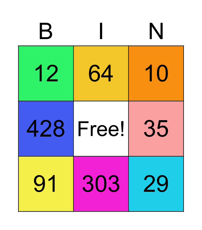 This bingo card has a free space and 8 words: 35, 10, 64, 91, 12, 29, 428 and 303.