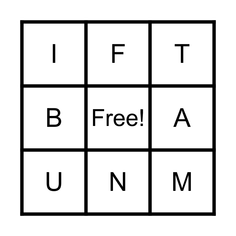 This bingo card has a free space and 8 words: A, T, F, U, I, M, B and N.