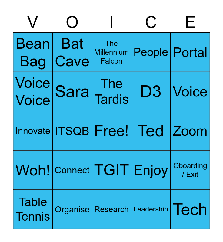 This bingo card has a free space and 34 words: Engagement, Leadership, Avoids, Planning Days, Woh!, Sara, Portal, Table Tennis, Bat Cave, The Room of Requirement, The Tardis, The Millennium Falcon, The Delorean, Mavis, Ted, Voice, Organise, Innovate, Connect, Enjoy, TGIT, Fun Day, Bean Bag, Zoom, Research, Tech, People, Marketing, D3, Voice Voice, Clients, ITSQB, Oboarding / Exit and Lifecycle.