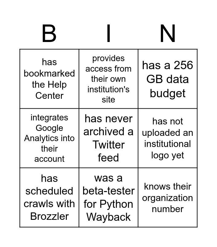 This bingo card has 26 words: Free!, never submitted a support ticket, was a beta-tester for Python Wayback, has tried to archive TikTok, has never archived a Twitter feed, has bookmarked the Help Center, has not uploaded an institutional logo yet, provides access from their own institution's site, misses Proxy Mode, knows how to clear their cache of Wayback cookies, knows their organization number, knows when and how they can delete a seed, is considering using Waybackfill service, has been web archiving for less than one year, has read Archive-It's September newsletter, has read an Archive-It blog post in the last month, integrates Google Analytics into their account, has opted-in for OAI-PMH on one of their collections, has a 256 GB data budget, has been to a previous in-person partner meeting, has more than 5 collections, has the "Upload WARCs" feature enabled, has made it past the Facebook login page after June, 2021, has a working Instagram capture, has scheduled crawls with Brozzler and has archived a page in French.