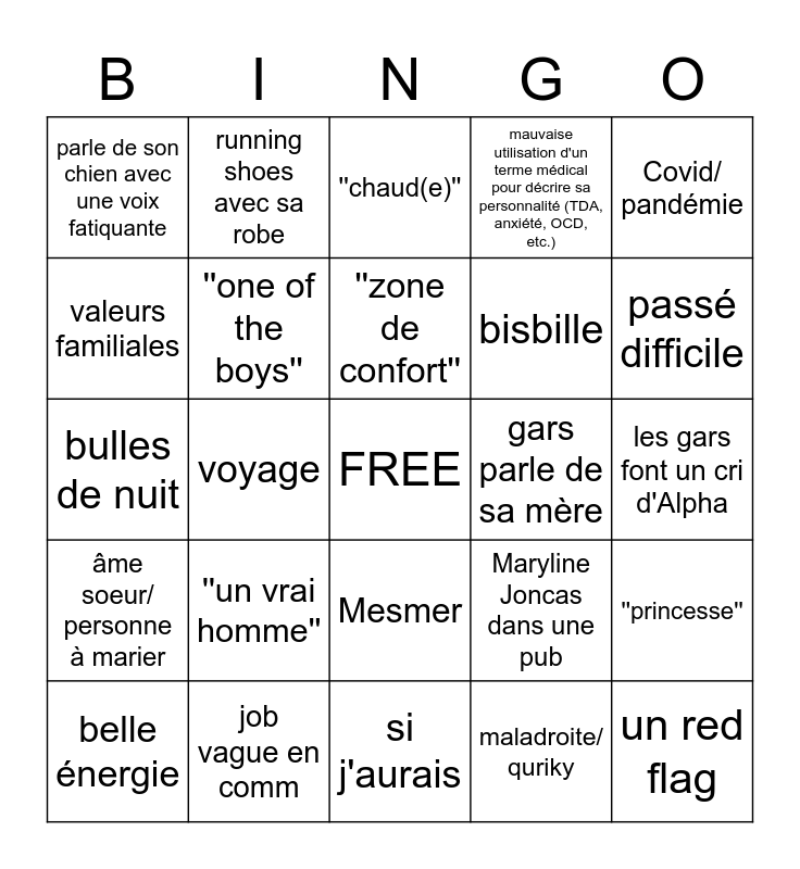 This bingo card has a free space and 24 words: ''un vrai homme'', job vague en comm, ''zone de confort'', belle énergie, Covid/ pandémie, parle de son chien avec une voix fatiquante, valeurs familiales, running shoes avec sa robe, gars parle de sa mère, Mesmer, bisbille, bulles de nuit, Maryline Joncas dans une pub, ''princesse'', ''one of the boys'', maladroite/ quriky, les gars font un cri d'Alpha, ''chaud(e)'', passé difficile, voyage, un red flag, âme soeur/ personne à marier, mauvaise utilisation d'un terme médical pour décrire sa personnalité (TDA, anxiété, OCD, etc.) and si j'aurais.