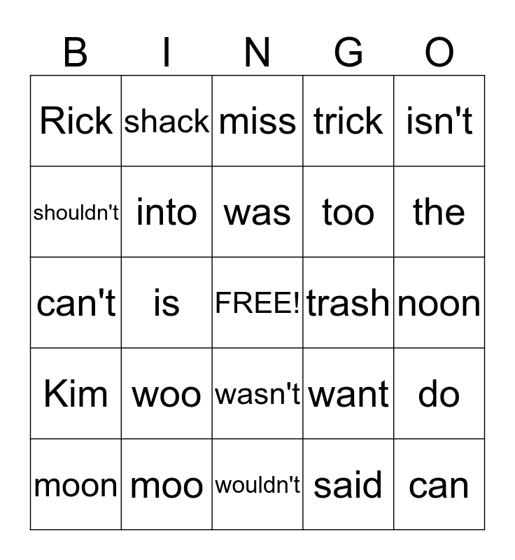 This bingo card has a free space and 24 words: woo, moo, was, moon, isn't, Rick, shouldn't, shack, trash, wasn't, too, can't, want, do, into, said, noon, miss, the, is, can, Kim, trick and wouldn't.