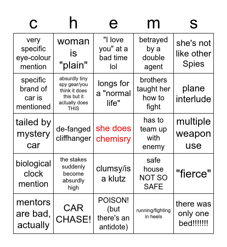 This bingo card has a free space and 64 words: gets chemicals wrong, the chemistry is romance, character makes a point of not wearing making, for "not like other girl" reasons?, "fierce", she's not like other girls, dramatic scene with wine, woman is "plain", overwritten metaphor, longs for a "normal life", real place is mentioned (bonus points if strange), clumsy/is a klutz, something critical about motherhood, multiple weapon use, she's not like other Spies, classical literature reference, specific brand of car is mentioned, de-fanged cliffhanger, very specific eye-colour mention, "research" is made into an unrealistic & romantic montage, brothers taught her how to fight, the stakes suddenly become absurdly high, biological clock mention, betrayed by a double agent, really bad coffee mention, orbs, someone comes back from the "dead", character SAYS "The Chemist", quirky pet, atrocious firearm safety, vampire mention, dads are OK :), no commies, overly specific body part mention, survives fall from impossible height, plane interlude, mentors are bad, actually, late night in the lab, running/fighting in heels, feminine mods to chemistry gear, absurdly tiny spy gear/you think it does this but it actually does THIS, tailed by mystery car, has to team up with enemy, handler sets her up!!!!!, anonymous phone call instructions, travel to "exotic" location, there was only one bed!!!!!!!, CAR CHASE!, hearing an ominous gun nearby, safe house NOT SO SAFE, mentor dies, lab explodes/significant explosion in a lab, that favor comes with a Price..........., POISON! (but there's an antidote), bad accent work (bonus if written out), have to talk to Normies, portentous dream, "I love you" at a bad time lol, gets framed, passport/currency montage, warcrimes, melts a door (lock), macgyvers a explosive device, uses feminine tools only a GIRL would have!!!!!!! to violent ends!!!! and in specifically all black.