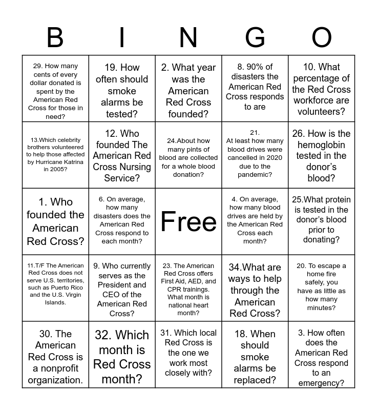 This bingo card has a free space and 24 words: 9. Who currently serves as the President and CEO of the American Red Cross?, 32. Which month is Red Cross month?, 24.About how many pints of blood are collected for a whole blood donation?, 30. The American Red Cross is a nonprofit organization., 10. What percentage of the Red Cross workforce are volunteers?, 29. How many cents of every dollar donated is spent by the American Red Cross for those in need?, 13.Which celebrity brothers volunteered to help those affected by Hurricane Katrina in 2005?, 19. How often should smoke alarms be tested?, 4. On average, how many blood drives are held by the American Red Cross each month?, 23. The American Red Cross offers First Aid, AED, and CPR trainings. What month is national heart month?, 21. At least how many blood drives were cancelled in 2020 due to the pandemic?, 1. Who founded the American Red Cross?, 34.What are ways to help through the American Red Cross?, 20. To escape a home fire safely, you have as little as how many minutes?, 12. Who founded The American Red Cross Nursing Service?, 18. When should smoke alarms be replaced?, 25.What protein is tested in the donor’s blood prior to donating?, 2. What year was the American Red Cross founded?, 26. How is the hemoglobin tested in the donor’s blood?, 6. On average, how many disasters does the American Red Cross respond to each month?, 3. How often does the American Red Cross respond to an emergency?, 11.T/F The American Red Cross does not serve U.S. territories, such as Puerto Rico and the U.S. Virgin Islands., 8. 90% of disasters the American Red Cross responds to are and 31. Which local Red Cross is the one we work most closely with?.