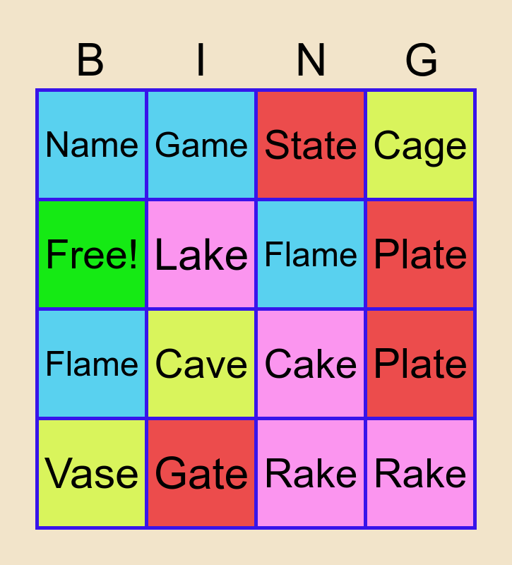 This bingo card has 16 words: Gate, Plate, State, Name, Flame, Game, Cake, Rake, Free!, Lake, Vase, Cage, Cave, Plate, Flame and Rake.