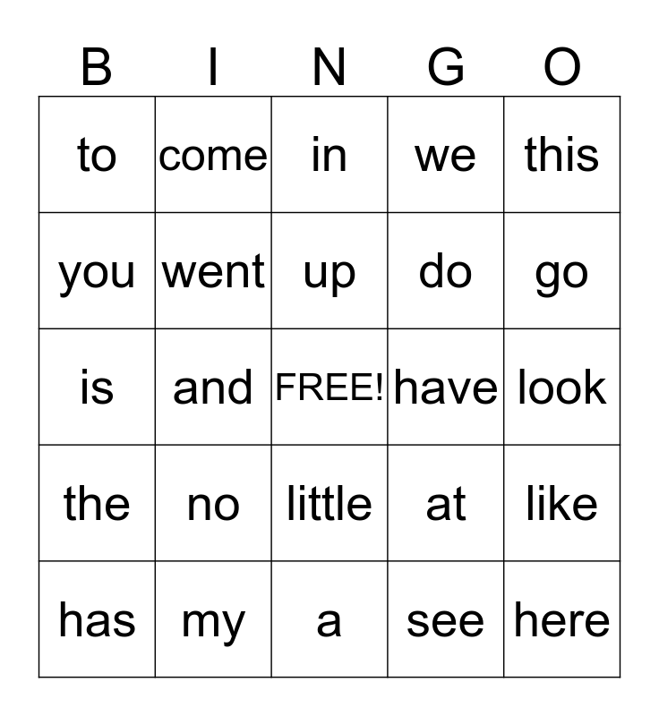 This bingo card has a free space and 24 words: no, my, up, has, this, to, you, come, have, little, do, is, at, like, went, see, look, in, go, and, here, the, we and a.