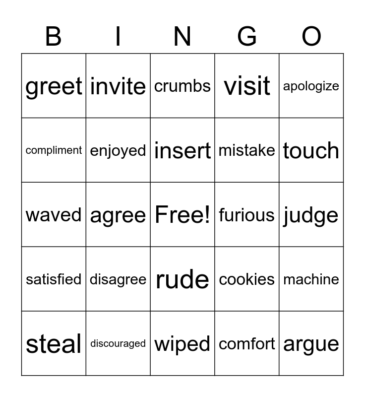 This bingo card has a free space and 24 words: disagree, discouraged, insert, steal, apologize, greet, compliment, invite, furious, rude, mistake, waved, cookies, machine, enjoyed, comfort, judge, crumbs, touch, agree, argue, satisfied, visit and wiped.