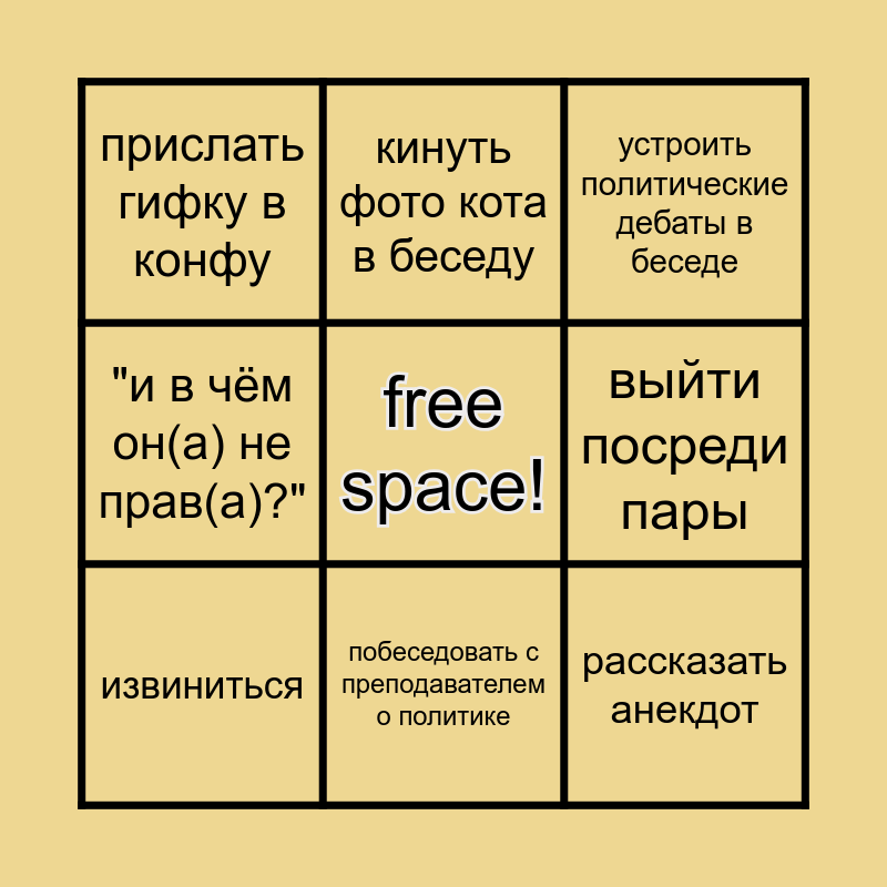 This bingo card has a free space and 8 words: "и в чём он(а) не прав(а)?", кинуть фото кота в беседу, выйти посреди пары, извиниться, устроить политические дебаты в беседе, прислать гифку в конфу, побеседовать с преподавателем о политике and рассказать анекдот.