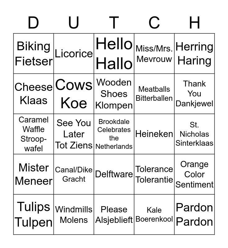 This bingo card has a free space and 24 words: Canal/Dike Gracht, Windmills Molens, Wooden Shoes Klompen, Tulips Tulpen, Herring Haring, Biking Fietser, Cheese Klaas, Licorice, Heineken, Delftware, Meatballs Bitterballen, Caramel Waffle Stroop- wafel, Tolerance Tolerantie, Orange Color Sentiment, Cows Koe, Kale Boerenkool, St. Nicholas Sinterklaas, Hello Hallo, Thank You Dankjewel, See You Later Tot Ziens, Pardon Pardon, Mister Meneer, Miss/Mrs. Mevrouw and Please Alsjeblieft.
