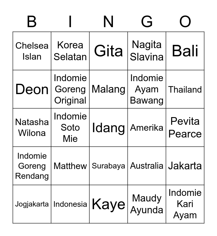 This bingo card has a free space and 24 words: Matthew, Indonesia, Malang, Jogjakarta, Bali, Chelsea Islan, Deon, Korea Selatan, Amerika, Surabaya, Indomie Ayam Bawang, Natasha Wilona, Australia, Jakarta, Indomie Goreng Original, Maudy Ayunda, Pevita Pearce, Gita, Thailand, Indomie Soto Mie, Indomie Kari Ayam, Indomie Goreng Rendang, Nagita Slavina and Kaye.