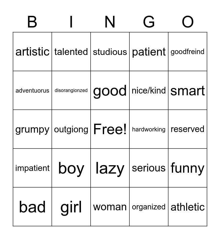 This bingo card has a free space and 24 words: boy, girl, good, bad, goodfreind, artistic, adventuorus, talented, hardworking, lazy, nice/kind, grumpy, serious, funny, disorangionzed, organized, reserved, studious, smart, outgiong, athletic, impatient, patient and woman.