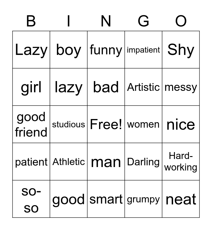 This bingo card has a free space and 24 words: Athletic, good, bad, so-so, Shy, Lazy, girl, boy, women, man, Artistic, good friend, Darling, Hard- working, lazy, grumpy, nice, funny, messy, studious, neat, patient, impatient and smart.
