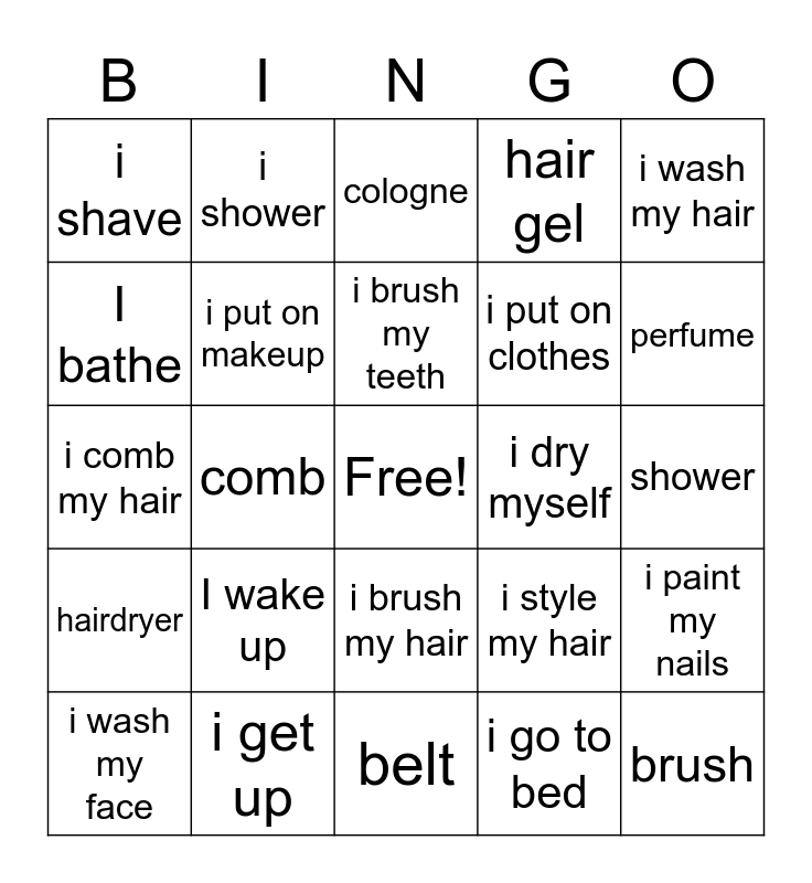 This bingo card has a free space and 24 words: I wake up, i get up, i brush my teeth, i wash my face, i wash my hair, i shave, I bathe, i shower, i dry myself, i brush my hair, i put on clothes, i comb my hair, i style my hair, i paint my nails, i put on makeup, i go to bed, shower, cologne, perfume, comb, brush, hairdryer, hair gel and belt.