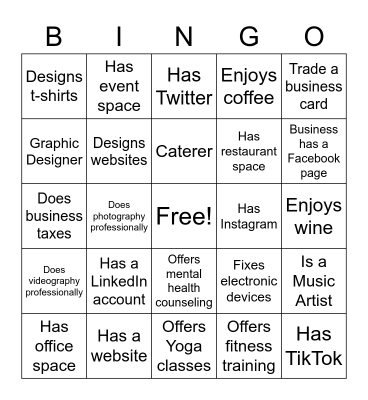 This bingo card has a free space and 24 words: Has a LinkedIn account, Has a website, Caterer, Has office space, Trade a business card, Designs t-shirts, Graphic Designer, Has event space, Has Instagram, Offers mental health counseling, Has restaurant space, Does business taxes, Fixes electronic devices, Is a Music Artist, Designs websites, Offers fitness training, Enjoys wine, Has Twitter, Business has a Facebook page, Does photography professionally, Has TikTok, Does videography professionally, Enjoys coffee and Offers Yoga classes.