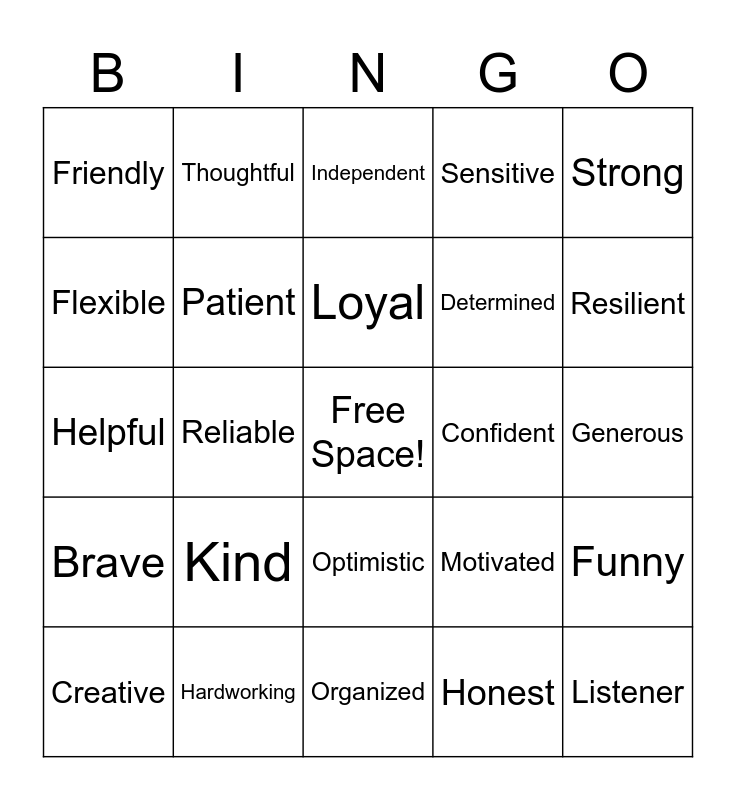 This bingo card has a free space and 24 words: Kind, Hardworking, Loyal, Creative, Strong, Friendly, Flexible, Thoughtful, Confident, Optimistic, Determined, Helpful, Motivated, Funny, Patient, Honest, Generous, Independent, Resilient, Reliable, Listener, Brave, Sensitive and Organized.