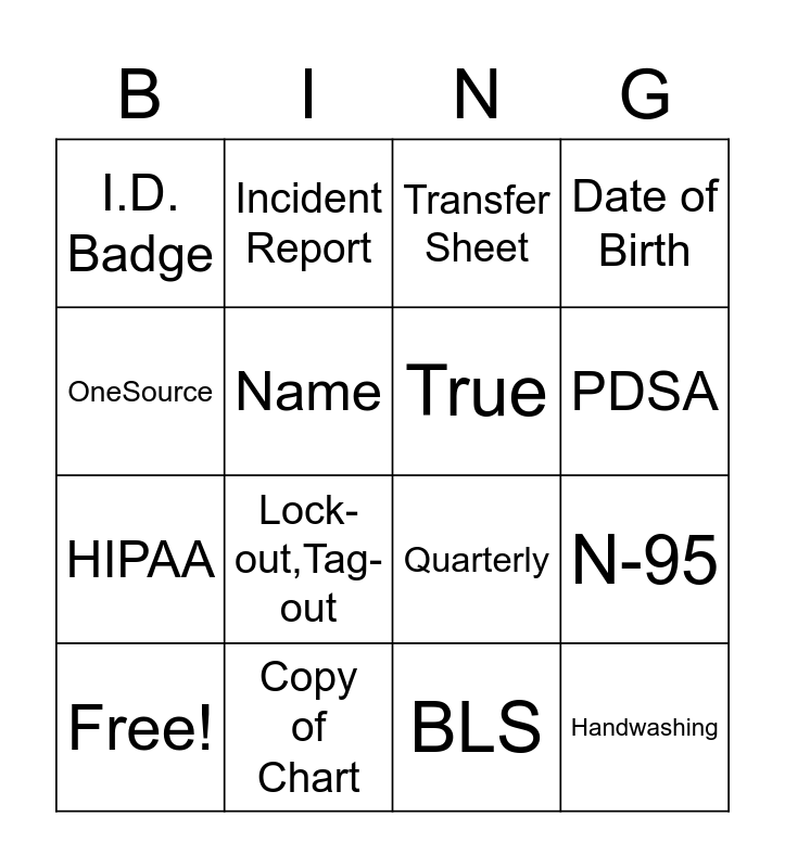 This bingo card has 23 words: Handwashing, False, PDSA, Narcotic Cabinet, OneSource, I.D. Badge, Name, Incident Report, Free!, Medtrainer, Lock-out,Tag-out, HIPAA, RACE, Annually, Copy of Chart, Trash Room, Transfer Sheet, Quarterly, True, N-95, Date of Birth, BLS and HVA.