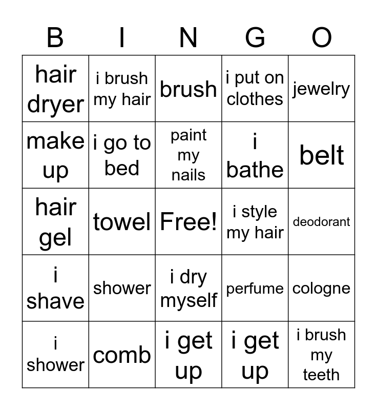 This bingo card has a free space and 24 words: shower, comb, paint my nails, i shower, jewelry, hair dryer, make up, i brush my hair, i style my hair, i dry myself, i bathe, hair gel, perfume, cologne, i go to bed, i get up, deodorant, brush, belt, towel, i brush my teeth, i shave, i put on clothes and i get up.