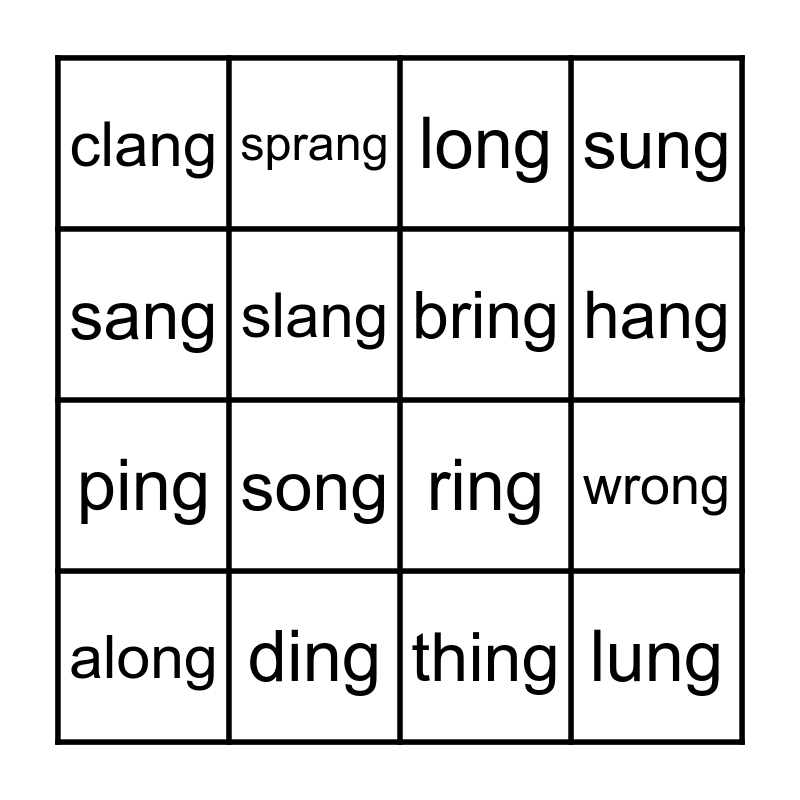 This bingo card has 25 words: bang, fang, hang, rang, sang, clang, slang, sprang, ding, king, ping, ring, sing, bling, bring, spring, thing, long, song, wrong, along, hung, lung, sung and swung.