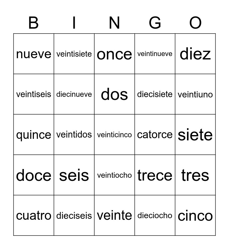 This bingo card has a free space and 29 words: uno, dieciseis, once, veinticuatro, diez, nueve, diecinueve, dos, catorce, tres, cuatro, veintidos, dieciocho, cinco, quince, ocho, veinte, trece, veintiuno, doce, seis, vientitres, diecisiete, siete, veintiseis, veintisiete, veintiocho, veintinueve and treinta.
