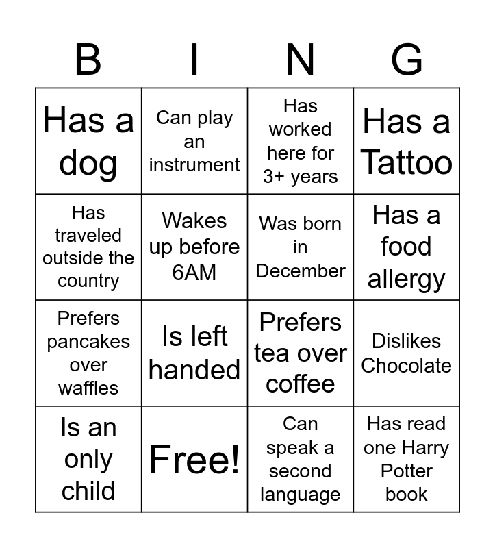 This bingo card has 16 words: Free!, Dislikes Chocolate, Has worked here for 3+ years, Has a dog, Prefers pancakes over waffles, Can play an instrument, Prefers tea over coffee, Can speak a second language, Has traveled outside the country, Wakes up before 6AM, Is an only child, Has a Tattoo, Is left handed, Has a food allergy, Was born in December and Has read one Harry Potter book.