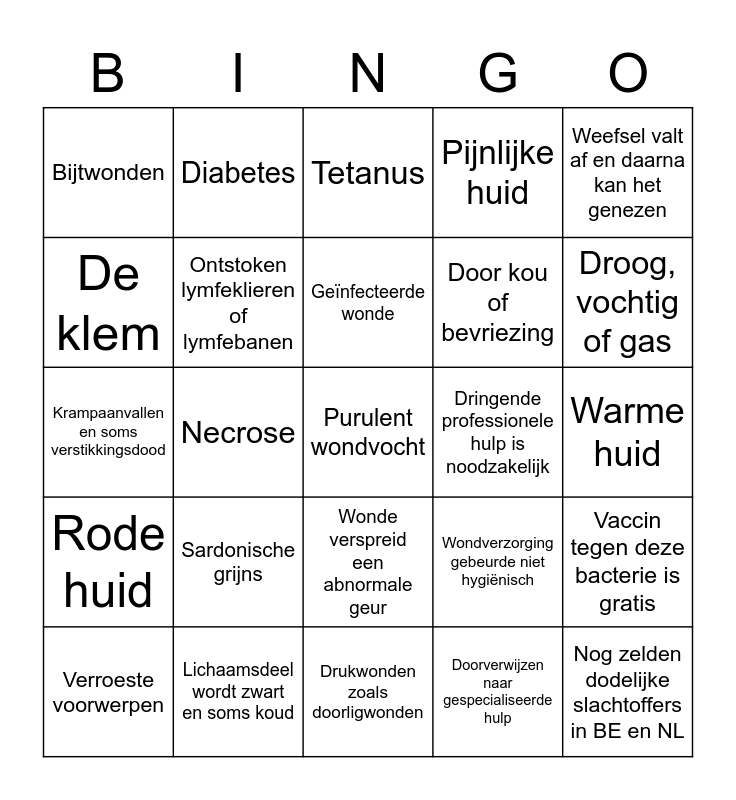 This bingo card has a free space and 29 words: Verroeste voorwerpen, Warmrode afgrenzing tussen ziek en gezond weefsel, Necrose, Gezwollen huid, Bijtwonden, Tetanus, Ontstoken lymfeklieren of lymfebanen, Sardonische grijns, Dringende professionele hulp is noodzakelijk, Lichaamsdeel wordt zwart en soms koud, Warme huid, Nog zelden dodelijke slachtoffers in BE en NL, Drukwonden zoals doorligwonden, Doorverwijzen naar gespecialiseerde hulp, Droog, vochtig of gas, SO heeft koorts, Wonde verspreid een abnormale geur, Rode huid, Weefsel valt af en daarna kan het genezen, Krampaanvallen en soms verstikkingsdood, Wondverzorging gebeurde niet hygiënisch, Gangreen, Door kou of bevriezing, De klem, Pijnlijke huid, Diabetes, Vaccin tegen deze bacterie is gratis, Geïnfecteerde wonde and Uitwerpselen van dieren.