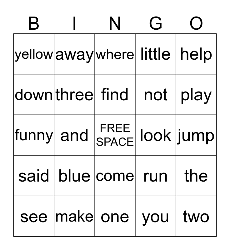 This bingo card has a free space and 24 words: blue, make, find, see, help, yellow, down, away, look, come, not, funny, run, the, three, you, jump, where, play, and, two, said, little and one.
