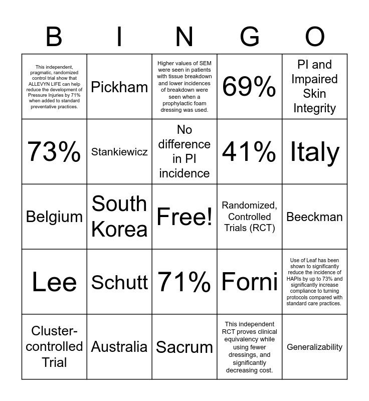 This bingo card has a free space and 24 words: Schutt, Australia, No difference in PI incidence, Cluster-controlled Trial, PI and Impaired Skin Integrity, This independent, pragmatic, randomized control trial show that ALLEVYN LIFE can help reduce the development of Pressure Injuries by 71% when added to standard preventative practices., 73%, Pickham, Randomized, Controlled Trials (RCT), 71%, 41%, Belgium, Forni, Use of Leaf has been shown to significantly reduce the incidence of HAPIs by up to 73% and significantly increase compliance to turning protocols compared with standard care practices., Stankiewicz, This independent RCT proves clinical equivalency while using fewer dressings, and significantly decreasing cost., Beeckman, Higher values of SEM were seen in patients with tissue breakdown and lower incidences of breakdown were seen when a prophylactic foam dressing was used., Italy, South Korea, Generalizability, Lee, 69% and Sacrum.