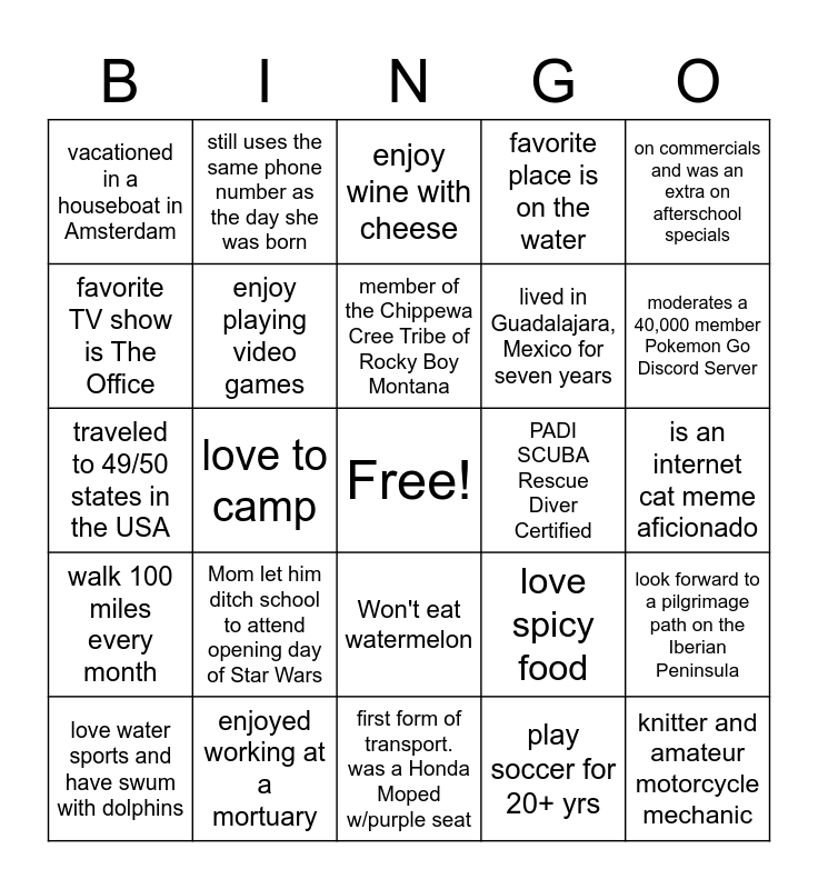 This bingo card has a free space and 26 words: Won't eat watermelon, play soccer for 20+ yrs, member of the Chippewa Cree Tribe of Rocky Boy Montana, enjoyed working at a mortuary, on commercials and was an extra on afterschool specials, vacationed in a houseboat in Amsterdam, favorite TV show is The Office, still uses the same phone number as the day she was born, is an internet cat meme aficionado, love spicy food, lived in Guadalajara, Mexico for seven years, traveled to 49/50 states in the USA, look forward to a pilgrimage path on the Iberian Peninsula, love water sports and have swum with dolphins, love to camp, learned English while attending a British School in Zimbabwe, favorite place is on the water, walk 100 miles every month, enjoy wine with cheese, knitter and amateur motorcycle mechanic, moderates a 40,000 member Pokemon Go Discord Server, first form of transport. was a Honda Moped w/purple seat, PADI SCUBA Rescue Diver Certified, Mom let him ditch school to attend opening day of Star Wars, enjoy playing video games and used to memorize license plates as a pastime.