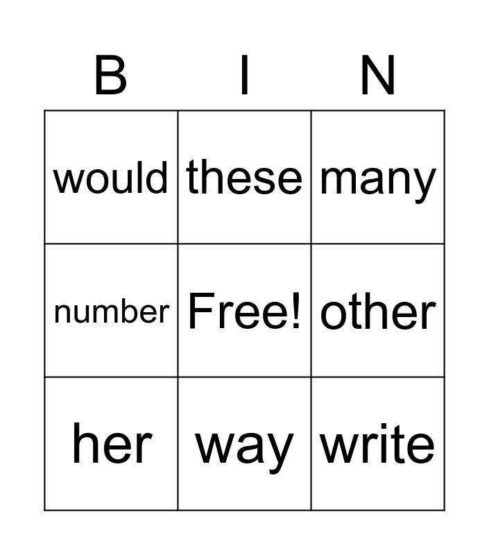 This bingo card has a free space and 8 words: other, many, these, her, would, write, number and way.