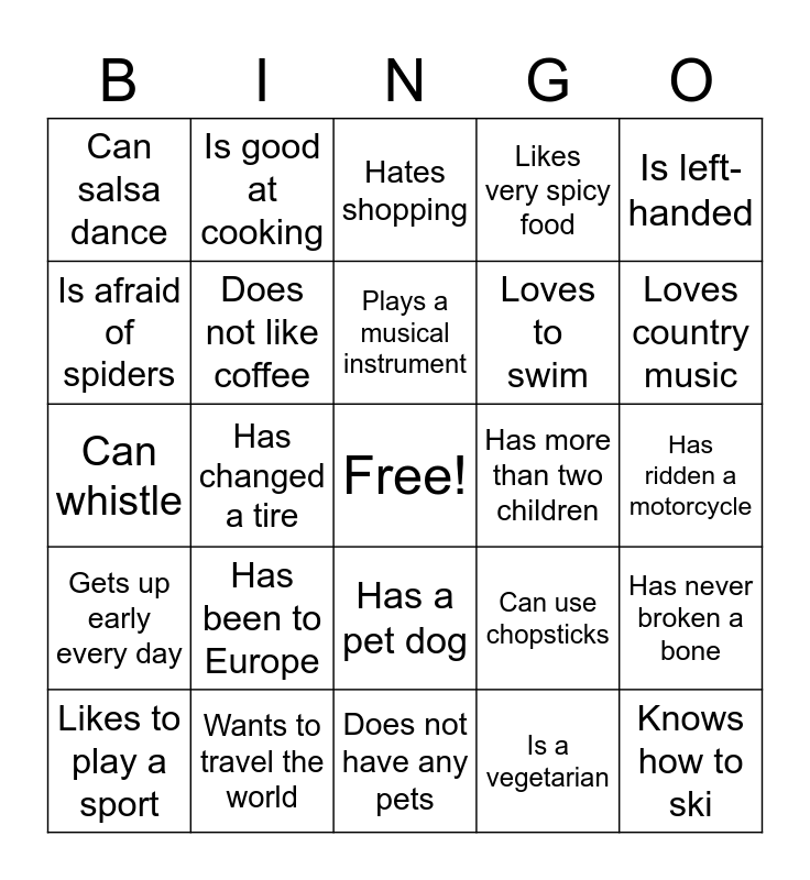 This bingo card has a free space and 25 words: Has been to Europe, Does not have any pets, Plays a musical instrument, Likes to play a sport, Is left-handed, Can salsa dance, Is afraid of spiders, Is good at cooking, Has more than two children, Has a pet dog, Loves to swim, Can whistle, Can use chopsticks, Has never broken a bone, Does not like coffee, Has a summer birthday, Has ridden a motorcycle, Hates shopping, Loves country music, Has changed a tire, Knows how to ski, Wants to travel the world, Gets up early every day, Likes very spicy food and Is a vegetarian.