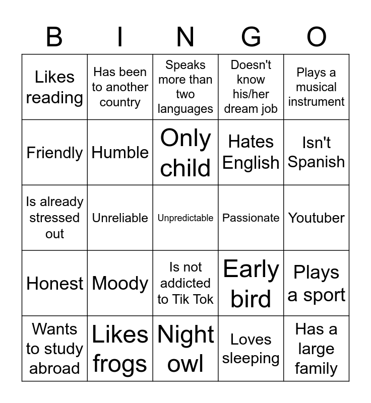 This bingo card has 25 words: Moody, Night owl, Only child, Wants to study abroad, Plays a musical instrument, Likes reading, Friendly, Has been to another country, Passionate, Is not addicted to Tik Tok, Hates English, Is already stressed out, Early bird, Plays a sport, Humble, Has a large family, Youtuber, Speaks more than two languages, Isn't Spanish, Unreliable, Unpredictable, Likes frogs, Honest, Doesn't know his/her dream job and Loves sleeping.