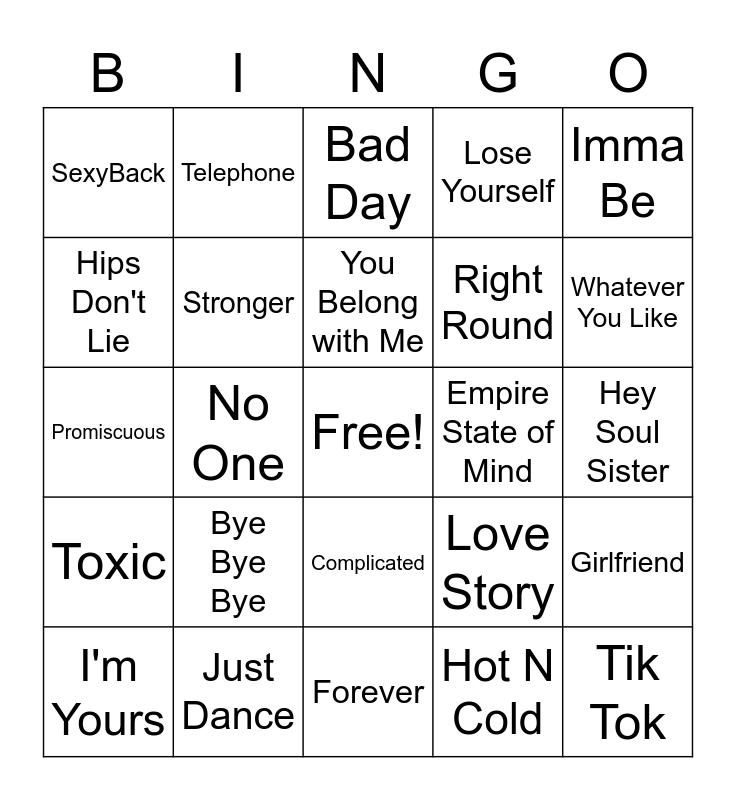 This bingo card has a free space and 54 words: I Gotta Feeling, Toxic, Hollaback Girl, Bleeding Love, Complicated, Single Ladies, Lose Yourself, Cry Me a River, Hips Don't Lie, Low, SexyBack, Mr. Brightside, Just Dance, I'm Yours, Party in the USA, Forever, Tik Tok, Right Round, Hot in Here, Hey Soul Sister, Love Story, Bad Romance, Empire State of Mind, Imma Be, Evacuate the Dance Floor, Telephone, The way I are, Umbrella, Clumsy, Hot N Cold, Viva La Vida, Disturbia, 1 2 Step, Candy Shop, Bad Day, SOS, Promiscuous, Girlfriend, Hey There Delilah, Stronger, Womanizer, Down, Fireflies, Whatcha Say, Bye Bye Bye, All the Small Things, Oops! I Did it Again, Crazy in Love, You Belong with Me, No One, Whatever You Like, Since U Been Gone, Crazy and Glamorous.