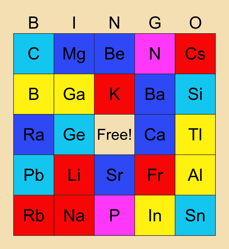 This bingo card has a free space and 24 words: Li, Na, K, Rb, Cs, C, B, Mg, Ca, Sr, Ba, Ra, Fr, Al, Ga, In, Tl, Be, Si, Ge, Sn, Pb, N and P.