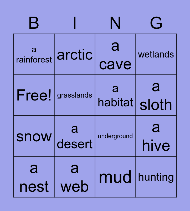 This bingo card has 16 words: a web, a hive, a cave, a rainforest, snow, arctic, underground, mud, Free!, grasslands, a nest, wetlands, a desert, a sloth, a habitat and hunting.