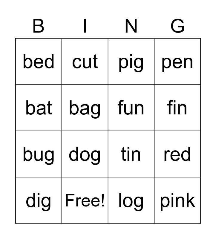 This bingo card has 24 words: cat, hit, fin, pit, bat, bed, bag, cut, Free!, hot, bug, tin, ten, hat, fun, pot, log, pig, dog, red, dig, pink, pen and fan.