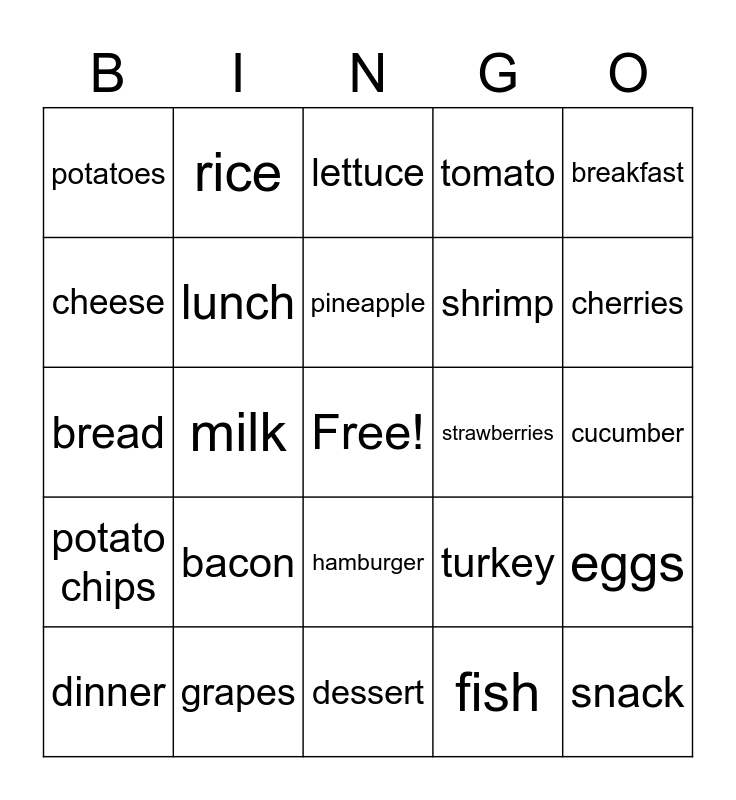 This bingo card has a free space and 34 words: chicken, fish, steak, french fries, potato chips, lunch, breakfast, dinner, rice, apple, pineapple, lettuce, onion, cookies, strawberries, cherries, grapes, bread, bacon, turkey, hamburger, carrots, potatoes, cucumber, dessert, snack, tomato, salad, shrimp, cheese, yogurt, milk, eggs and butter.