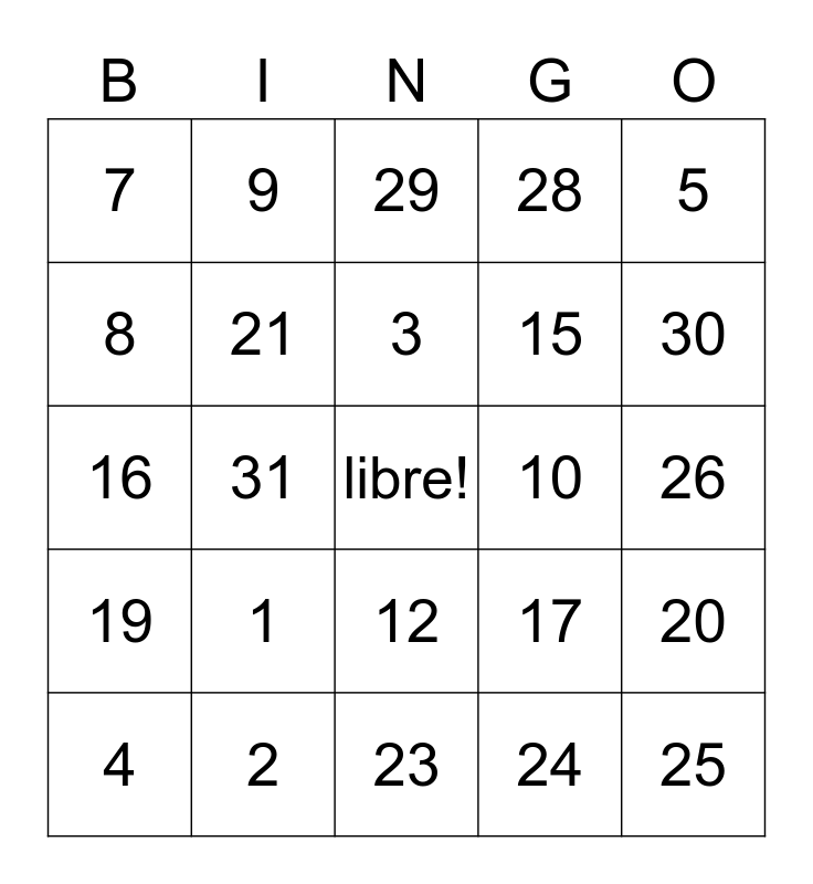 This bingo card has a free space and 24 words: 1, 2, 3, 4, 5, 7, 8, 9, 10, 12, 15, 16, 17, 20, 21, 24, 26, 29, 30, 31, 25, 19, 28 and 23.